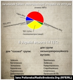 48% електроенергії в Україні виробляють атомні станції, 8 – гідро, ще 8 – теплоелектроцентралі (ТЕЦ), які працюють як на вугіллі, так і на газі, решта 32% припадає на теплоелектростанції (ТЕС), 90% з яких працюють на вугіллі. Значна частина ТЕСів використовують як паливо антрацит, а шахти, які його видобувають, розташовані на території, яка зараз підконтрольна бойовикам. Відтак, за оцінками експертів, наразі дефіцит антрациту в Україні становить близько 10 мільйонів тонн.