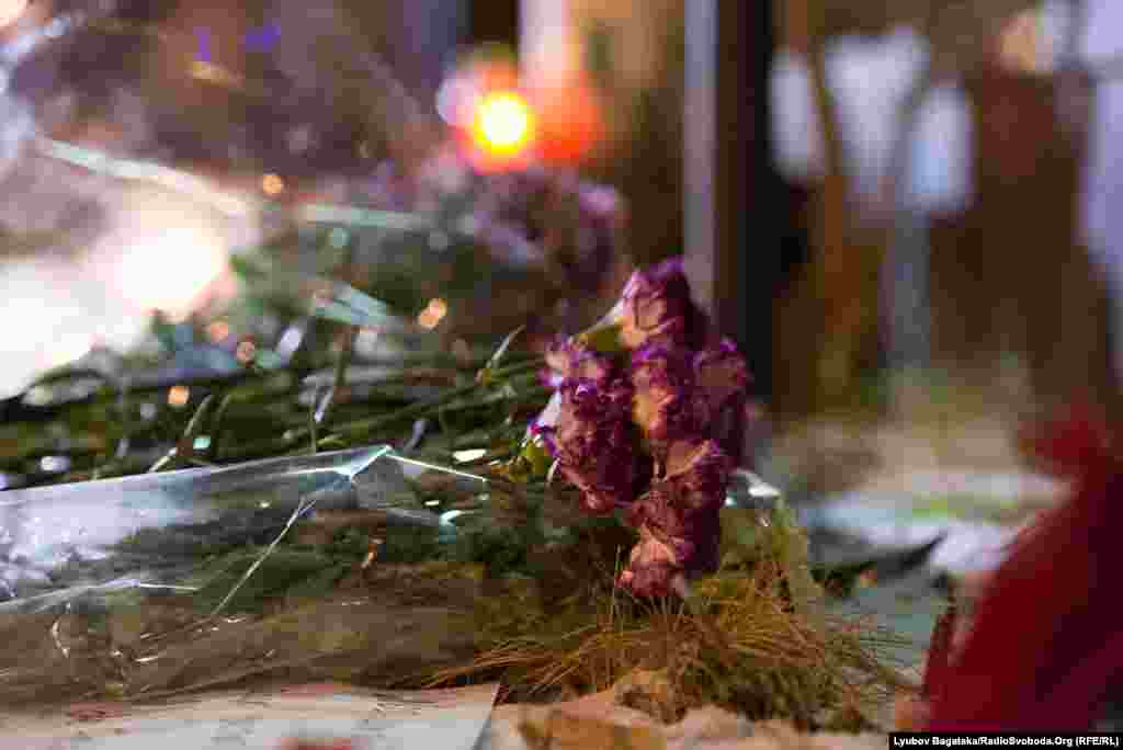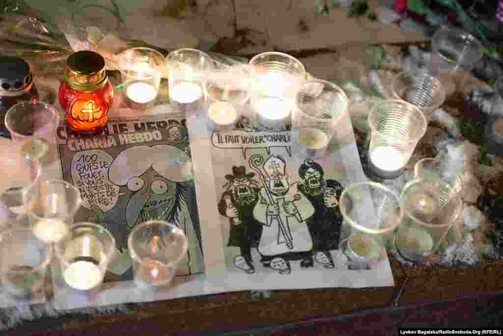 Кілька десятків людей прийшли до Посольства Франції в Україні, аби покласти квіти та запалити свічки. Кияни принесли під будівлю посольства кілька плакатів на підтримку свободи слова та на знак співчуття родинам і колегам загиблих, а також кілька карикатур, що раніше пулікувалися у тижневику Charlie Hebdo. У середу, 7 січня, у результаті нападу на редакцію було вбито 12 людей, ще 11 були поранені.