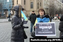 Багато учасників тримали плакати з намальованим розстріляним автобусом та написом «Je suis Volnovakha» («Я є Волноваха»).