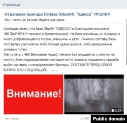 «Повідомляємо всіх, що база ОБрСН «ОДЕСА» у Краснодоні оточена ПВК Вагнера з танками і бронетехнікою. На базі ополченці з України та багато добровольців із Росії, жінки і діти. Особовому складу бази поставили ультиматум: або повна здача зброї, або роззброєння силовим шляхом», – таке повідомлення з’явилося на офіційній сторінці «Одеси» в соцмережі «ВКонтакте».