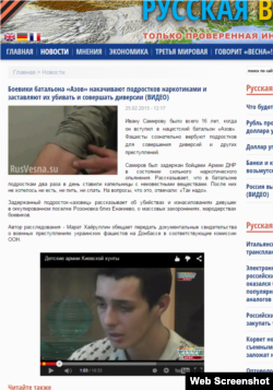 Сепаратистський сайт «Русская весна» повідомляє, що буцімто у батальйоні «Азов», який вже став полком, «бойовики» «накачують» підлітків наркотиками і примушують їх чинити диверсії або ж навіть убивати. Проросійські інтернетні ЗМІ масово передрукували таку новину, підкріплюючи її відеозаписом.