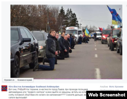 У соціальних мережах у групах «Антимайдан» і «Новоросія» активно поширюють фото, на якому люди стоять на колінах, а повз них проїжджають машини із українськими прапорами.