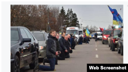 Знімок, який при цьому публікують, насправді показує, як жителі міста Коломиї засвідчують повагу загиблому під час бойових дій на Сході України землякові Роману Фурику. Люди стоять на колінах перед колоною автомобілів, щоб провести в останню путь свого героя. На підтвердження цього є і відео українських медіа.