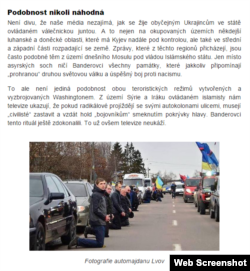 (Оригінал: «Není divu, že naše média nezajímá, jak se žije obyčejným Ukrajincům ve státě ovládaném válečnickou juntou. A to nejen na okupovaných územích někdejší luhanské a doněcké oblasti, které má Kyjev nadále pod kontrolou, ale také ve střední a západní části rozpadající se země. Zprávy, které z těchto regionů přicházejí, jsou často podobné těm z území dnešního Mosulu pod vládou Islámského státu» – так пише чеський портал, відомий, серед іншого, матеріалами антєвропейського, антиамериканського і проросійського змісту, на кшталт: «США хочуть війни з Росією за будь-яку ціну. Американські окупаційні підрозділи вже в нас і не ховаються!»)