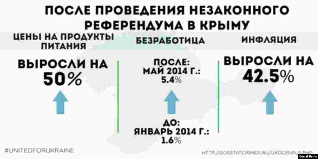 У перші дні окупації Криму російська пропаганда розповідала жителям півострова про прекрасне життя, яке на них чекає. Реальність виявилася більш жорстокою. Посольство США в Росії у своєму Twitter опублікувало серію інфографік про реальний стан справ у Криму.