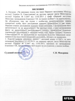 «Короткі цифрові рукописні написи – вихідний номер «І-2687» та дата складання документу «13.02.2015» на першому аркуші листа Міністерства юстиції України №І-2687 від 13.02.2015 – виконано не громадянкою Ігнатенко, зразки почерку якої надано на дослідження, а іншою особою», – ідеться у висновку за підписом судового експерта Світлани Мендриної.