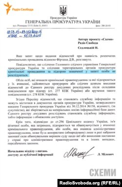 Генеральна прокуратура і Служба безпеки України не розпочинали ніяких кримінальних проваджень стосовно олігарха, спонсора Партії регіонів Дмитра Фірташа. Про це йдеться у відповідях від ГПУ й СБУ на запити журналістам програми «Схеми», спільного телепроекту Радіо Свобода і Першого Національного.