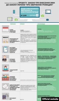 Якщо закон ухвалять, українці отримають змогу звертатися з електронною петицією до органів влади. Адресатами стануть Адміністрація президента, парламент, Кабмін чи органи місцевого самоврядування. Петиція буде розміщена на відповідному веб-сайті, де під нею підписуватимуться всі охочі. У разі, коли набереться більше ніж 25 тисяч голосів (хоча пропонується і можливість місцевим радам встановлювати власну кількість), петиція буде відправлена на розгляд відповідного органу влади, котрий має про це повідомити.