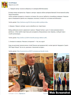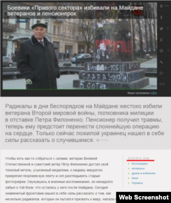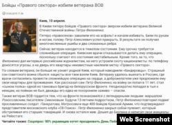 10 квітня проросійські інтернетні ЗМІ повідомили про нібито «побиття ветерана Великої вітчизняної війни бійцями «Правого сектору». Однак виявилось, що ця новина з’явилась ще рік тому на російському каналі «НТВ», а нині інформацію спотворили.