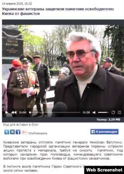 14 квітня на сайті телеканалу «Звезда» продемонстрували відео мітингу ветеранів Другої світової війни біля пам’ятника генералу Ватутіну в Києві – у матеріалі із заголовком: «Українські ветерани захистили пам’ятник визволителю Києва від фашистів».