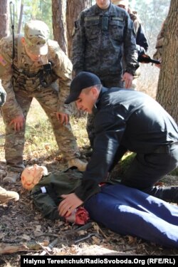 Серед лісу у наметах розташовані класи, з усім сучасним обладнанням. Частина учасників навчань на теоретичних заняттях, інші вчаться надавати медичну допомогу. Американські солдати пояснюють, показують на манекенах – як діяти при конкретному пораненні. Українські бійці повторюють і відповідають на запитання, що потрібно робити у тій чи іншій ситуації. Важливо: пораненого винести з поля бою у надійніше місце, вміти зупинити кровотечу собі чи зробити обезболюючий укол. Із групою працює перекладач.