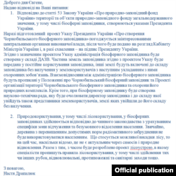 Як саме розбудовуватимуть чорнобильський біосферний заповідник – на запит Радіо Свобода відповіла головний спеціаліст департаменту заповідної справи Міністерства екології та природних ресурсів Анастасія Драпалюк. За її словами, заповідник своїм указом створює президент України, проект цього указу вже готовий.