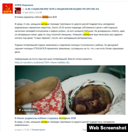 7 травня про це повідомили на сайті «Молодіжне інформаційне агентство Новоросія»: «Ветеран Великої вітчизняної війни Зінаїда Сергіївна 6 травня, близько третьої години дня поверталася до себе додому. Біля під’їзду їй перегородили шлях кілька молодих людей і запитали, за кого бабуся воювала. Навіть не дочекавшись відповіді, один із молодиків завдав літній жінці удару по обличчю. Після чого бабуся впала, і її ще кілька разів вдарили ногами, вигукнули гасло «Слава Україні» і втекли з місця злочину».