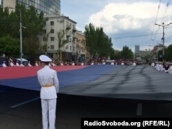Врешті, марш зупиняється, кадети виносять величезний прапор «ДНР» і махають ним під «гімн» так званої «республіки», який вперше можна було почути під час параду 9 травня. «Рівно рік тому ми всі разом сказали «ні» фашизму, рабству і страху. Рівно рік тому ми проголосували за незалежність, свободу і щасливе майбутнє наших дітей» – сказав керівник угруповання «ДНР» і у всьому звинуватив Київ.