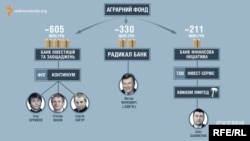 Згідно з документами, які отримала програма «Схеми», понад 1 мільярд гривень Аграрного фонду від кінця минулого року було розміщено на депозитних рахунках у трьох комерційних банках: «Банку інвестицій та заощаджень», «Радикал банку» і банку «Фінансова ініціатива».