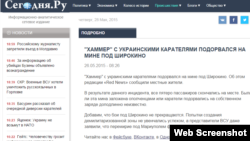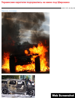 Російські та проросійські ЗМІ проілюстрували фотофейками новину про те, що буцімто українські бійці під Широкиним підірвались на міні у автомобілі «Хаммер» американського виробництва.