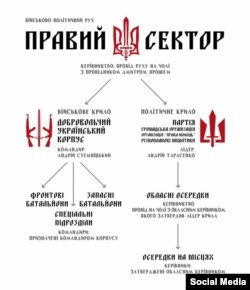 Структура «Правого сектору» така: є провідник – Дмитро Ярош, у нього є два заступники, розповів Радіо Свобода речник «Правого сектору» Артем Скоропадський. Перший заступник – це командир Добровольчого українського корпусу (ДУК) Андрій Стемпіцький, а інший – заступник з політичної роботи Андрій Тарасенко. Відповідно, це дві структури, які входять у спільний воєнно-політичний рух. Є також медичний батальйон – це не окрема структура, він теж входить в ДУК.