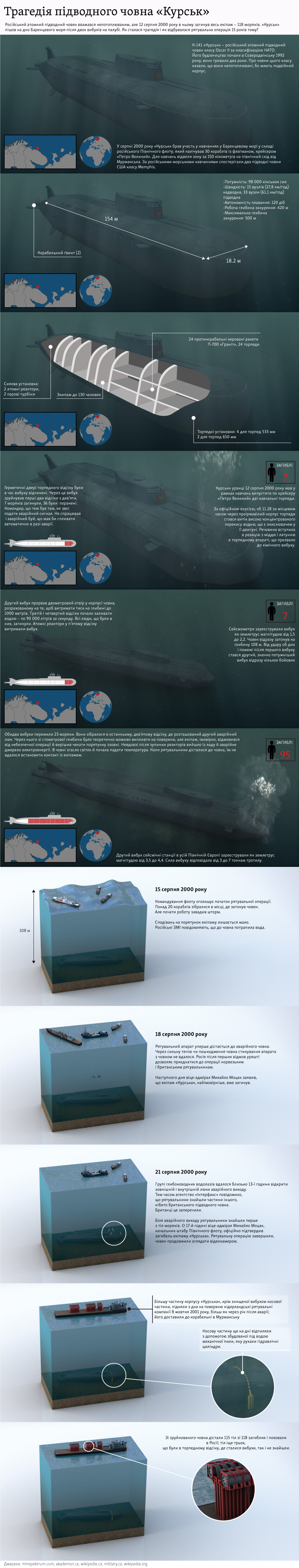 Зі зруйнованого човна дістали 115 тіл зі 118 загиблих і поховали в Росії; тіл іще трьох, що були в торпедному відсіку, де сталися вибухи, так і не знайшли.