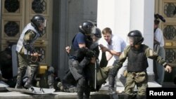 Сутички під стінами парламенту України виникли після того, як Верховна Рада підтримала в першому читанні зміни до Конституції щодо децентралізації. Протестувальники, що виступали проти таких змін, почали наступ на будівлю Верховної Ради, яку охороняв кордон правоохоронців. За словами народного депутата, члена колегії Міністерства внутрішніх справ Антона Геращенка, у правоохоронців кинули бойову гранату.