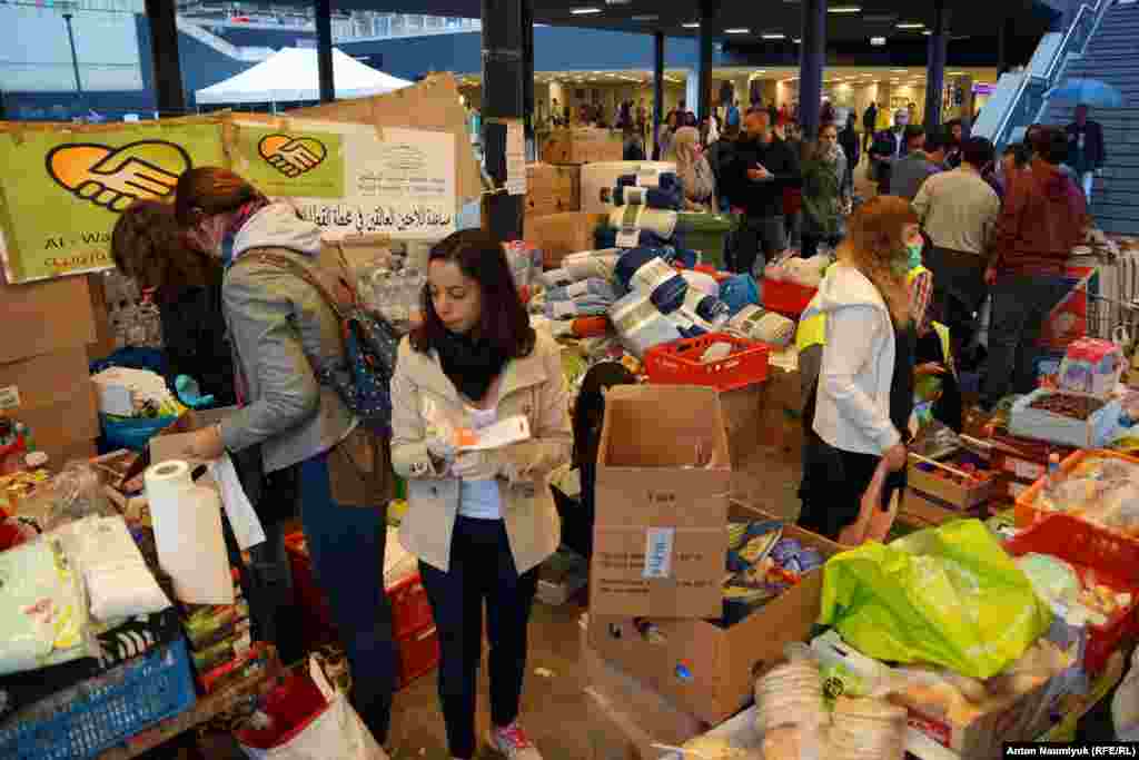 Організована роздача одягу та взуття, які збирають по всій Європі, їжі та чистої питної води, про що повідомляють розвішані в метро оголошення арабською