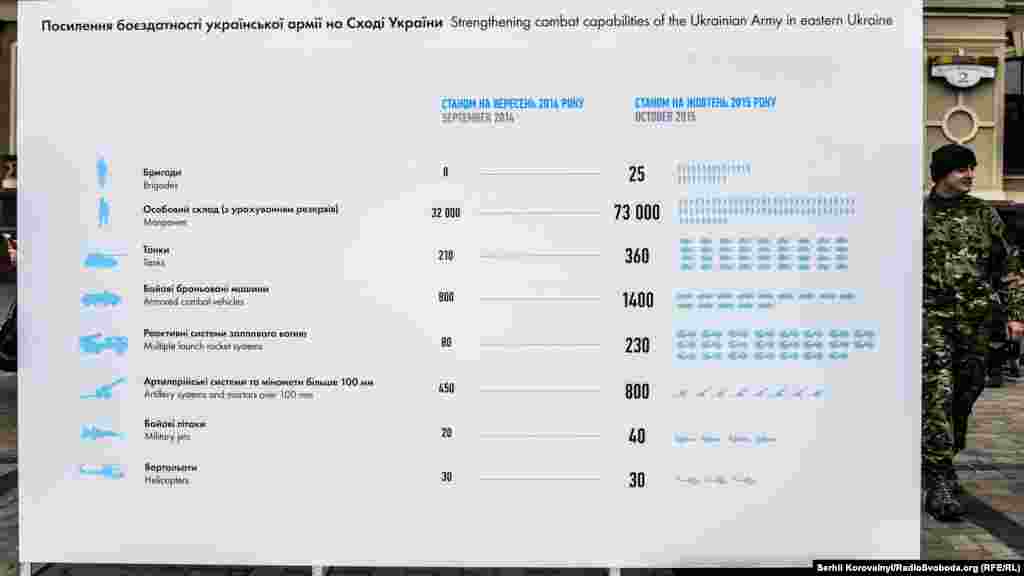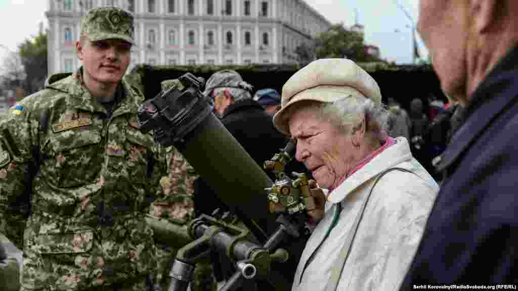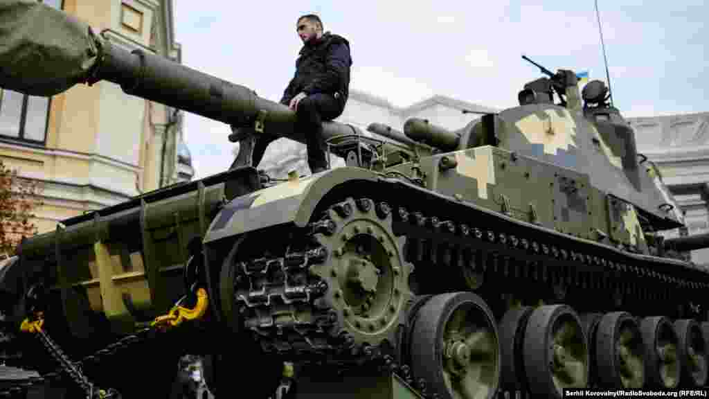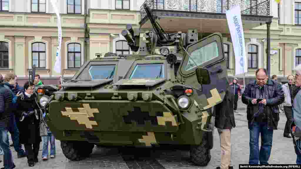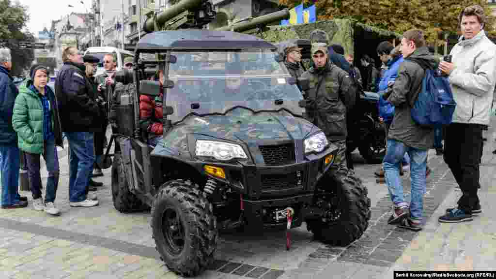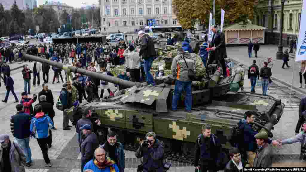 У центрі столиці до Дня захисника України відкрито виставку української військової техніки. На Михайлівській площі представлені зразки техніки та озброєння українського й іноземного виробництва, що перебувають чи поступають на озброєння армії. На виставці також представили прапор із Донбасу, який українська делегація розгорнула на засіданні Генеральної асамблеї ООН під час виступу російського президента Володимира Путіна.