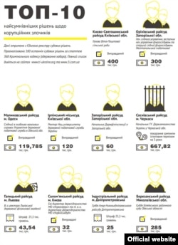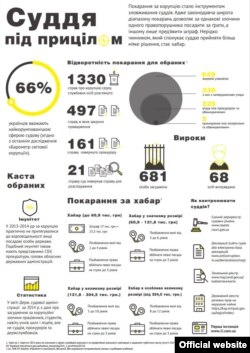 «Transparency International Україна» та інтернет-видання про судові спори «Перша інстанція» у рамках проекту «Судді під прицілом» проаналізували 100 останніх вироків за статтею 368 Кримінального кодексу (отримання неправомірної вигоди), що розміщені у Єдиному держреєстрі судових рішень і дійшли до таких висновків: за ґрати сідає тільки п’ята частина хабарників.