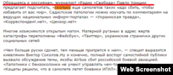 Скріншот із повідомленням про катастрофу, на якому фото чоловіка на тлі лого Радіо Свобода, поширили й деякі російських ЗМІ. Зокрема, сайт видання «Комсомольская правда». Цитату користувача «Скільки ще таких літаків таких треба збити, щоб звільнити від вас світ» розмістили такі російські портали, як «Сегодня.ру». У коментарях до матеріалів про катастрофу зазначають, що це – слова «журналіста Радіо Свобода».