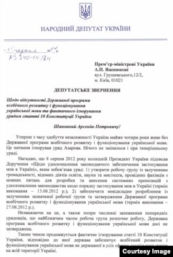 Ба більше. Арсеній Яценюк повністю проігнорував депутатське звернення «Щодо відсутності Державної програми всебічного розвитку і функціонування української мови та фактичного ігнорування урядом статті 10 Конституції України» Ірини Фаріон від 15 серпня 2014 року. В цьому документі тодішній народний депутат просила надати інформацію, коли буде затверджено Державну програму всебічного розвитку і функціонування української мови і що робить Кабінет міністрів України для дотримання положень статті 10 Конституції України усіма посадовими і службовими особами органів державної влади, органів місцевого самоврядування, державних і комунальних навчальних закладів України при виконанні ними службових обов’язків.