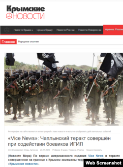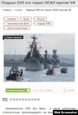 Названі сайти вмістили публікації під заголовком: «Vice News: підрив ліній електропередачи в Україні – спільний теракт з «Ісламською державою» проти Чорноморського флоту».