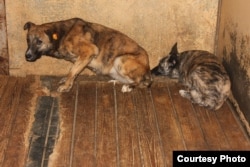 Вольєри, у притулку – це заіржавіла залізна перегородка із дерев’яними, саморобними стінами, які в деяких місцях перелатані кілька разів.
