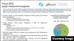 Хоча не менш ніж половина ВПО (54%) розглядає свій статус як тимчасовий і збирається повернутися додому протягом наступних декількох років, більшість чекає нормалізації обстановки та/або відновлення юрисдикції України над Донбасом. Тим часом ВПО та члени їхніх сімей успішно адаптуються на новому місці: знаходять роботу та віддають до навчальних закладів дітей. І 26% взагалі не збираються повертатися додому на постійне місце проживання.