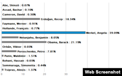 «Раніше в перебігу опитування німецького видання Alles Schall und Rauch жителі Німеччини визнали Володимира Путіна найчеснішим політиком у світі. А от Ангела Меркель разом із президентом США Бараком Обамою, а також його українським колегою Петром Порошенком і главою Туреччини Реджепом Таїпом Ердоганом названі головними політичними брехунами», – йдеться на сайті.