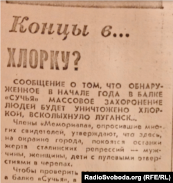 Громадськість обурилася, в червні 1990 року в «Літературної газеті» навіть з'явилася стаття «Кінці у хлорку», де чекістів прямо звинувачували, що причиною настільки поспішного закриття місця поховань в тому, що там серед інших речей розстріляних знайшли залишки шинелей іноземного виробництва – в «Сучій балці» могли розстрілювати польських офіцерів зі Старобільського табору. Це загрожувало луганському КДБ міжнародним скандалом, розповідає Валерій Снєгірьов, автор книги «Це було в Старобільську»: