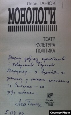 До речі, за допомогою Леся Танюка та його «Щоденників» я встановив дату, коли познайомився з дружиною. За плином часу точний день забув, але пам’ятав, де і за яких обставин це трапилося. А діялося це в Будинку вчених у морозному січні 1988 року на одному з «Київських театральних вечорів», які вів Лесь Танюк і де він читав чотири заборонені тоді вірші Василя Стуса. Точну дату нашого з дружиною знайомства вказав щоденниковий запис…