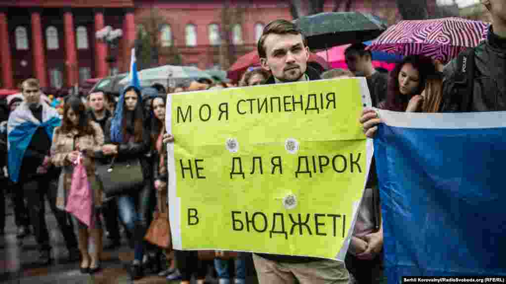 Напроти червоного корпусу Київського національного університету імені Шевченка зібралися близько тисячі студентів зі всієї України. За їхніми словами, вони протестували проти намірів органів влади звузити соціально-економічні права студентів, учнів професійно-технічних навчальних закладів, зокрема, на отримання стипендії, на доступну освіту, забезпечення гуртожитками, охорону здоров’я, соціальний захист тощо.