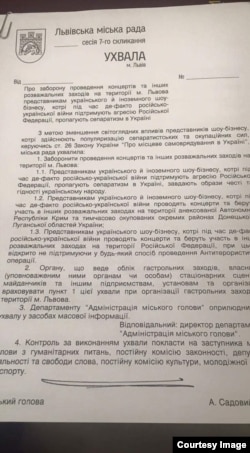 Найбільшим каменем спотикання між чиновниками міськради і громадськими активістами було питання щодо виступів представників українського шоу-бізнесу, які гастролювали і далі бувають з концертами у Росії. На останній сесії міськради депутати проголосували лише за назву ухвали «Про заборону проведення концертів та інших розважальних заходів на території Львова представниками українського та іноземного шоу-бізнесу, котрі під час де-факто російсько-української війни підтримують агресію Росії, пропагують сепаратизм в Україні», а редакційній комісії доручили написати сам текст документа.
