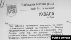 Громадські активісти наполягли на тому, щоб заборонити у Львові виступи українським виконавцям, які концертують у Росії. І редакційна комісія чітко це виписала в ухвалі. Відтак у Львові заборонено виступати «представникам українського шоу-бізнесу, котрі під час де-факто російсько-української війни проводять концерти та беруть участь у розважальних заходах на території Росії, при цьому відкрито не підтримуючи у будь-який спосіб проведення Антитерористичної операції». Тобто, якщо хтось у час військового конфлікту в Україні побував з концертом у Росії чи буде, то, згідно з рішенням міськради, йому мають заборонити гастролі у Львові. Навіть, якщо це улюблений виконавець львів’ян. З цим положенням погоджувались не всі депутати міськради. А саме представники фракції «Самопоміч» вважали, що українські виконавці, виступаючи у Росії, можуть пропагувати Україну, допомогти росіянам зрозуміти ситуацію на Донбасі. Водночас більшість обранців переконані, що у час проведення АТО не припустимо заробляти гроші у Росії.
