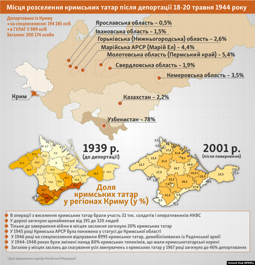 Географія депортації кримських татар – ще одна сторінка трагедії цілого народу. Вигнані зі своєї батьківщини, вони були розселені практично по всьому Радянському Союзу: в центрі, на Уралі, в Сибіру і, звичайно ж, в Центральній Азії. Але найдраматичніше змінилася після 1944 року карта Криму. Місця заслань, число депортованих і факти про насильницьке вигнання цілого народу – в новій інфографіці, підготовленій проектом Радіо Свобода «Крим.Реалії».