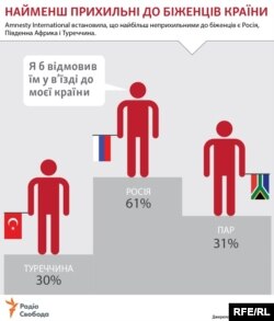 Громадяни Китаю є найбільш прихильними до біженців, громадяни Росії – найменше. Такими є результати опитування, опублікованого правозахисною організацією Amnesty International, яке проводили у 27 країнах. Згідно з розробленим індексом прихильності-2016, до біженців добре ставляться також німці, британці та канадці. Тоді як лідерами антирейтингу поряд із росіянами є громадяни Індонезії, Таїланду та Польщі. Найбільше громадян України із зони бойових дій на Донбасі, за даними ООН, виїхали саме до Росії. Зараз, зазначають правозахисники, багато з них повертаються назад до України, оскільки так і не змогли влаштуватися. Якою є ситуація з біженцями у Росії, і якою щодо цього є політика Кремля?
