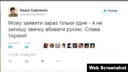 До новини підкріпили скріншот із Twitter, де Надія Савченко буцімто повідомляє: «Можу заявити зараз тільки одне – я не залишу звички вбивати русню. Слава Україні!»