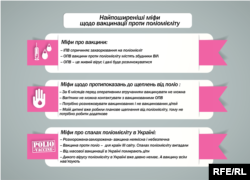 Так само під час спалаху поліомієліту в Україні були дуже поширені публікації, в яких йшлось про буцімто неналежну якість вакцини, та й інші варіанти дезінформації. У мережі поширювали міфи про вакцинацію проти поліомієліту. Наприклад, що інактивована поліовакцина (ІПВ) спричиняє захворювання на поліомієліт або ж що оральна поліовакцина (ОПВ) буцімто містить збудники ВІЛ та інші.
