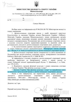 «Міжнародна тенісна академія», що відкрилась майже рік тому на землі киян, не відноситься до дитячо-юнацької спортивної школи. Про це йдеться в офіційній відповіді Міністерства молоді та спорту України.