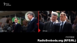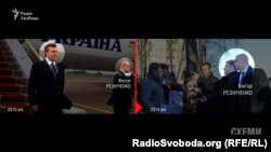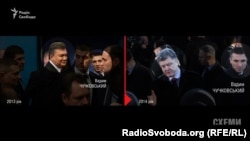 А ще є кадри з відео відомої зустрічі Віктора Януковича і журналістів у Межигір’ї у 2011 році. Вадим Чучковський подає президентським гостям парасольки.