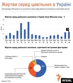 Згідно з даними ООН, число жертв серед цивільних у червні зросла вдвічі – до 69 осіб, з яких 12 загинули. Липень теж виявився кривавим: протягом місяця 8 цивільних були вбиті і 65 поранені.