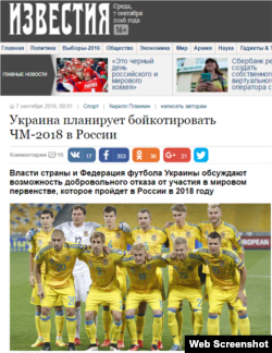 За інформацією «Известий», Національна збірна України з футболу в разі, якщо вона пройде кваліфікацію і проб’ється до фінальної частини чемпіонату світу-2018 в Росії, нібито може бойкотувати турнір через політичні мотиви. Також на сайті «Известий», посилаючись на власне джерело у Федерації футболу України, повідомили, що імовірність повного ігнорування чемпіонату зараз розглядається на рівні адміністрації організації і керівництва країни.