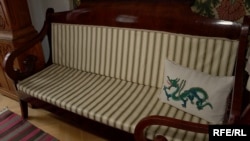 – Так. І ця ширма. Ви можете помітити, що змінена тканина, тому що на жаль тканина не збереглася. Майже всі речі були реставровані, але все, що ви бачите – це з нашого дому. Наприклад, можна розповісти про вишивку цю. Це робота особистої друкарки Грушевського, тому що спочатку він писав тільки від руки, а потім, коли почали вимагати друковане, він не призвичаївся до машинки і в нього була особиста друкарка. Вона була другом родини і робила їм такі подарунки, тому що закінчила художню школу в Парижі. І вона малювала, у нас є її малюнки.