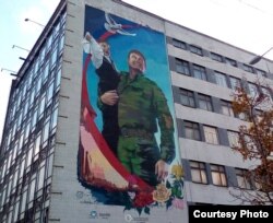 На некоторых зданиях можно встретить граффити с вооруженными мятежниками, которые дарят цветы детям, либо держат их на руках