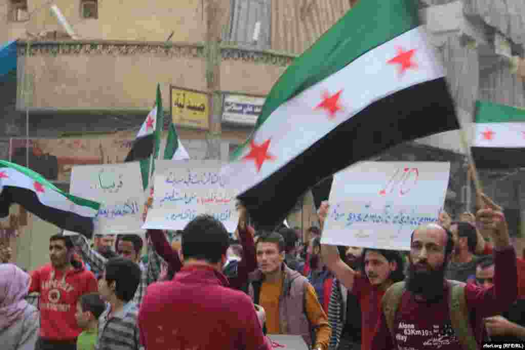 Сирійські активісти у східній частині Алеппо вийшли на знак протесту щодо атак на місто, після запеклих боїв 22 жовтня.