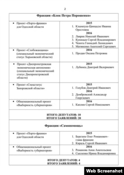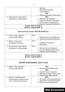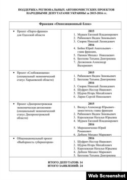 Українські ЗМІ у четвер опублікували документ із так-званої зламаної поштової скриньки радника президента Росії Владислава Суркова. В ньому, зокрема аналізують, яка кількість депутатів України підтримала різні «автономістські» проекти у 2015-16 роках. Перший у списку – «Порто-франко». А далі: проект «Спецстатус Запорожской области», проект «Днепропетровская экономическая автономия», проект «Слобожанщина».
