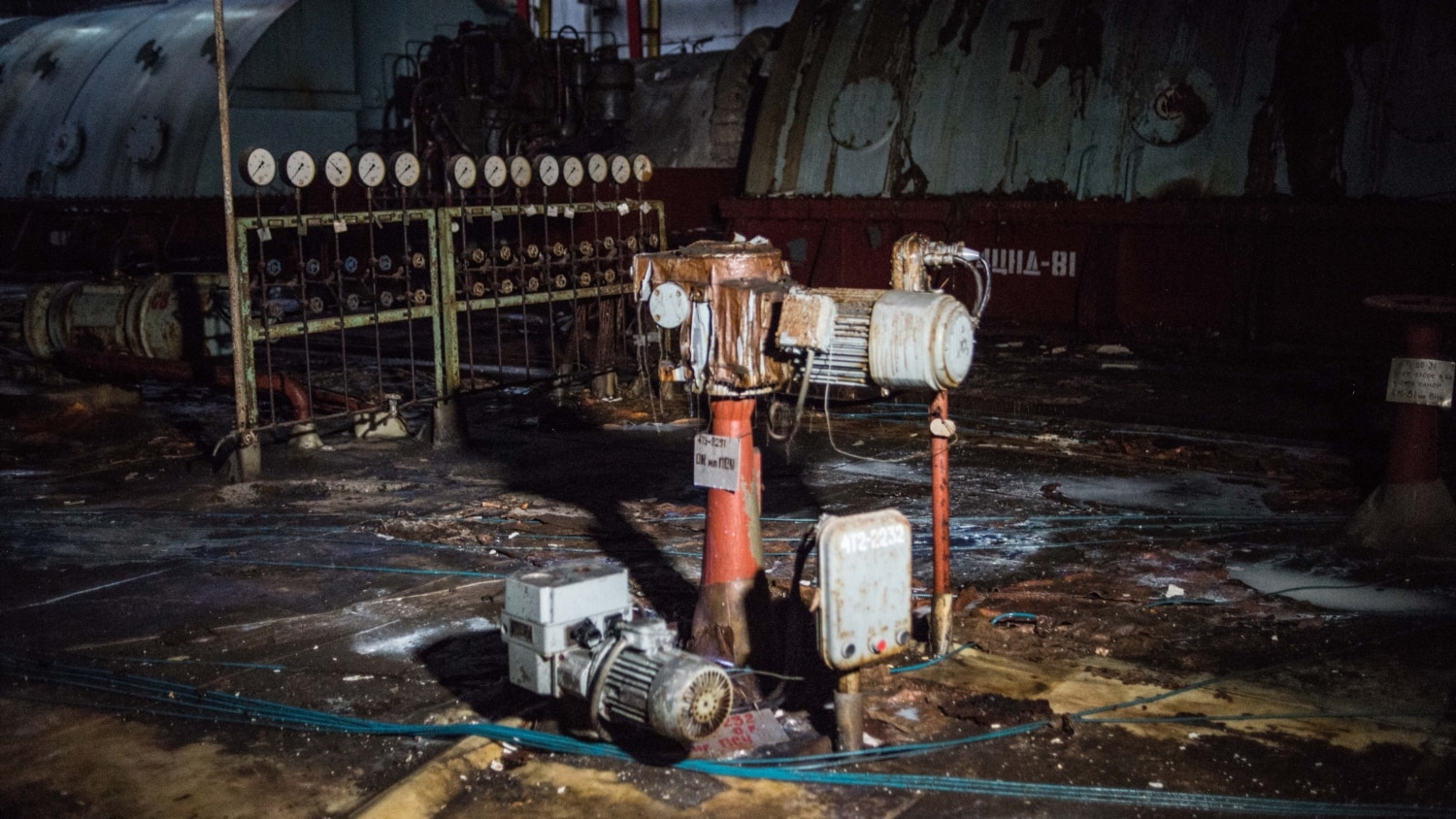 Сьому і восьму турбіни від іншої, чистішої і цілої, частини машзалу, відділяє масивна захисна бетонна стіна «саркофагу». Підходимо до стіни, переступаючи через уламки. У ній – дверний отвір, у темряві видніють обриси турбін.